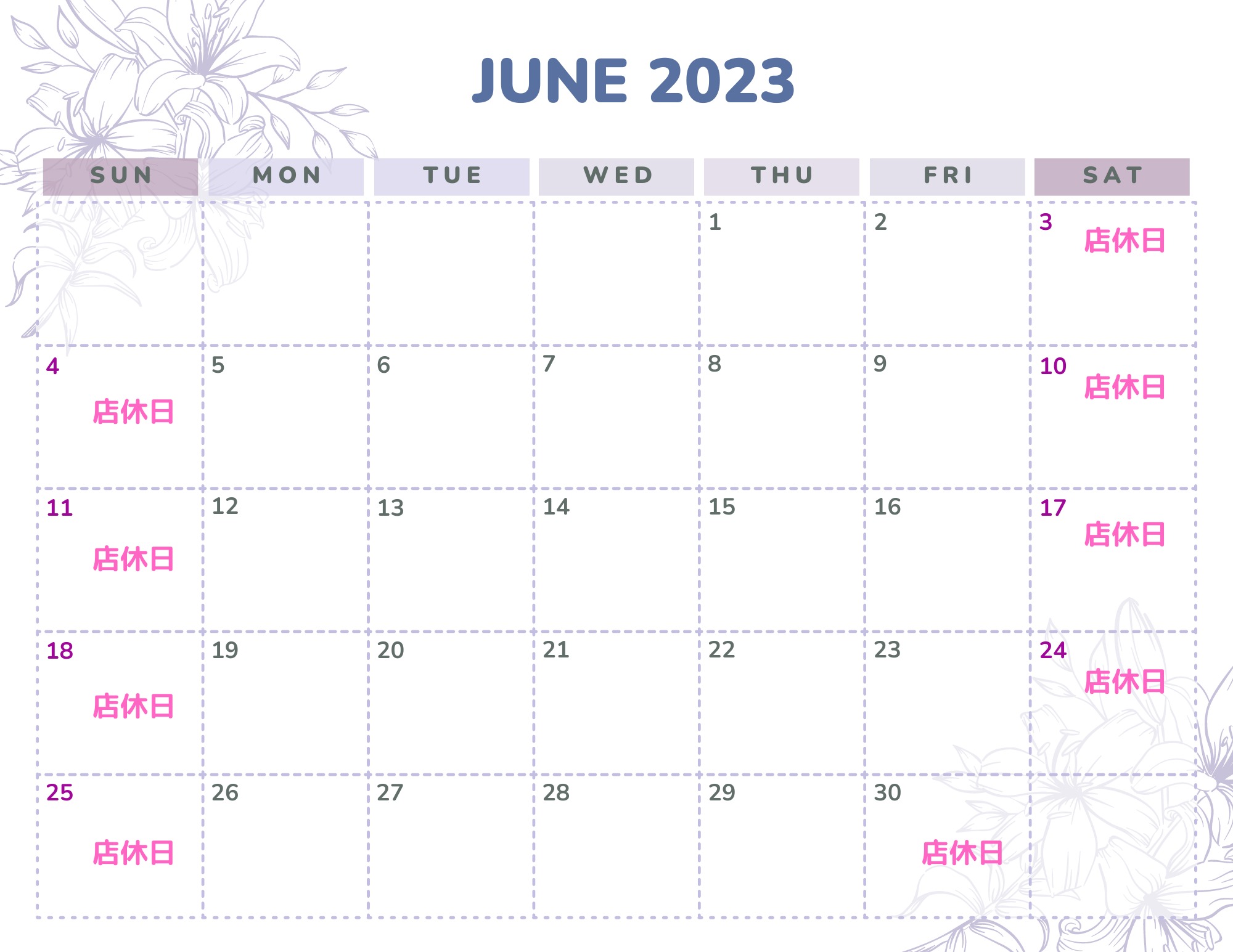 2023年6月の営業日カレンダーです